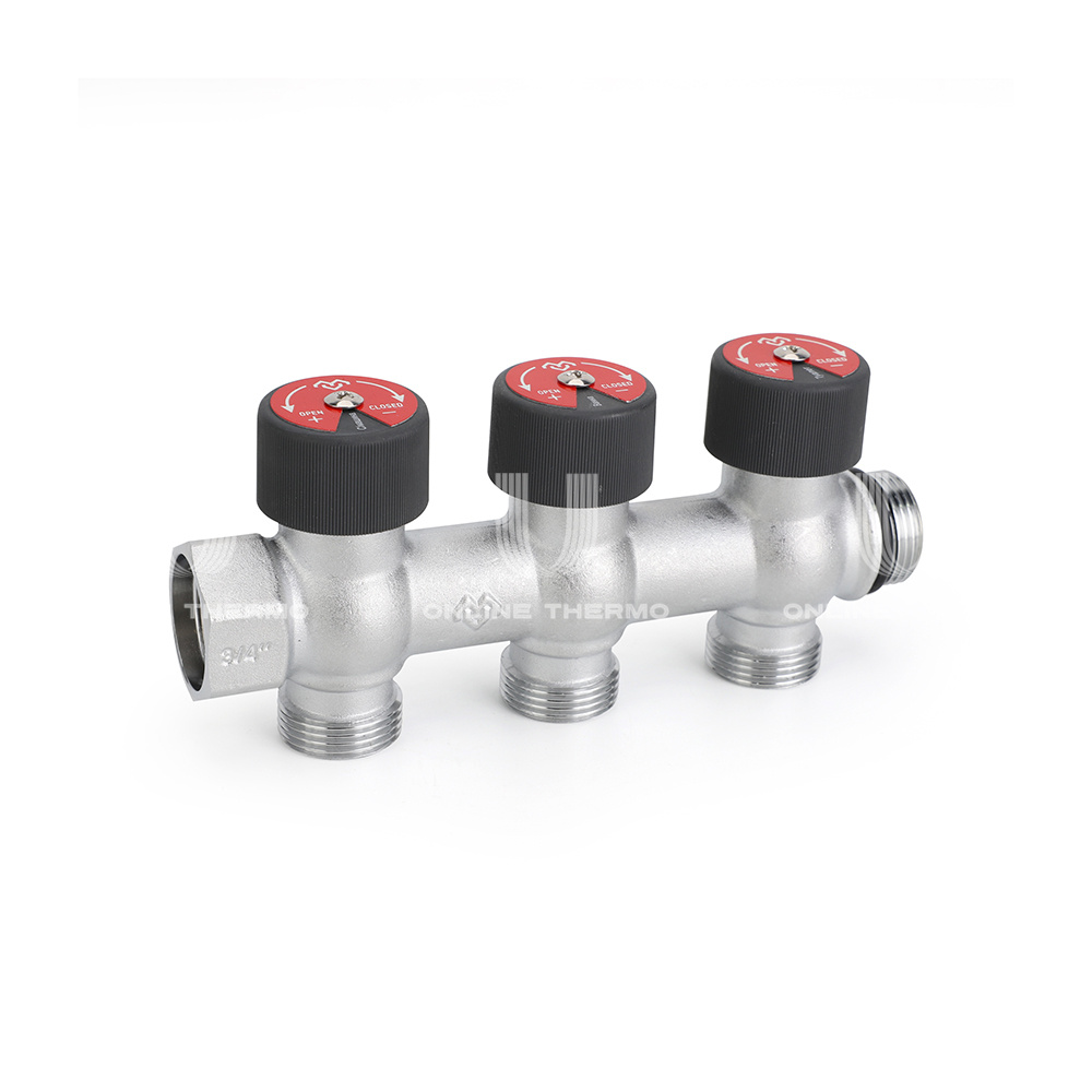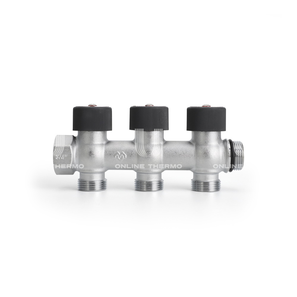 Распределительные коллекторы поставляются с размером основной магистрали 3/4" или 1" и могут иметь два, три или четыре выхода с наружной резьбой 3/4"EK.