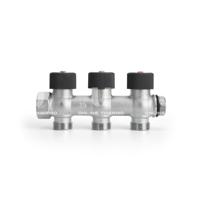 Распределительные коллекторы с регулировочными клапанами соединяются по принципу модульности. Благодаря специальной конструкции резьбы с самоуплотняющимся кольцом обеспечивается герметичность и центровая соосность. Расстояние между отводами составляет 50 мм.