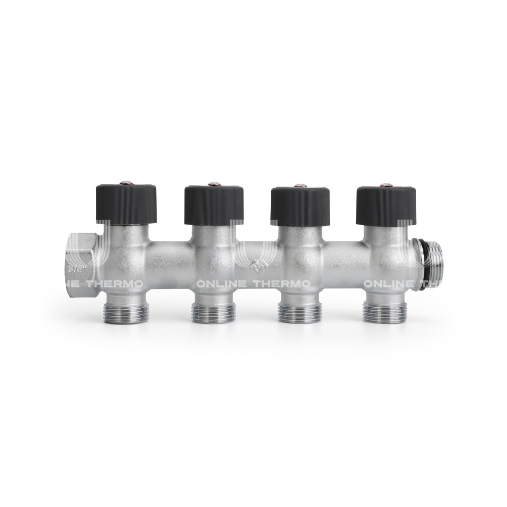 Распределительные коллекторы поставляются с размером основной магистрали 3/4" или 1" и могут иметь два, три или четыре выхода с наружной резьбой 3/4"EK.