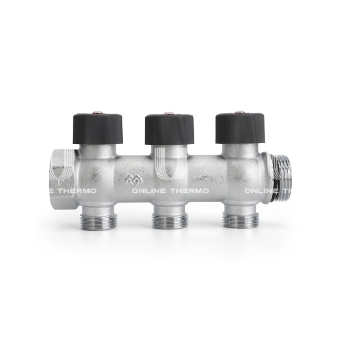 Распределительные коллекторы с регулировочными клапанами соединяются по принципу модульности. Благодаря специальной конструкции резьбы с самоуплотняющимся кольцом обеспечивается герметичность и центровая соосность. Расстояние между отводами составляет 50 мм.