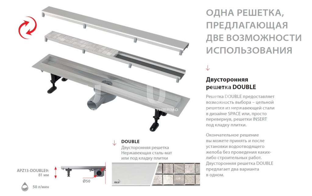 Производитель предлагает три варианта длины желобов (750 мм, 850 мм и 950 мм), сифон APZ-S9 с высотой монтажа 81 мм, а также уникальную двустороннюю решетку DOUBLE. Решетка DOUBLE – это комбинация двух решеток SPACE (нержавеющая сталь-мат) и INSERT (под кладку плитки), Вы можете самостоятельно менять стиль, просто перевернув решетку.