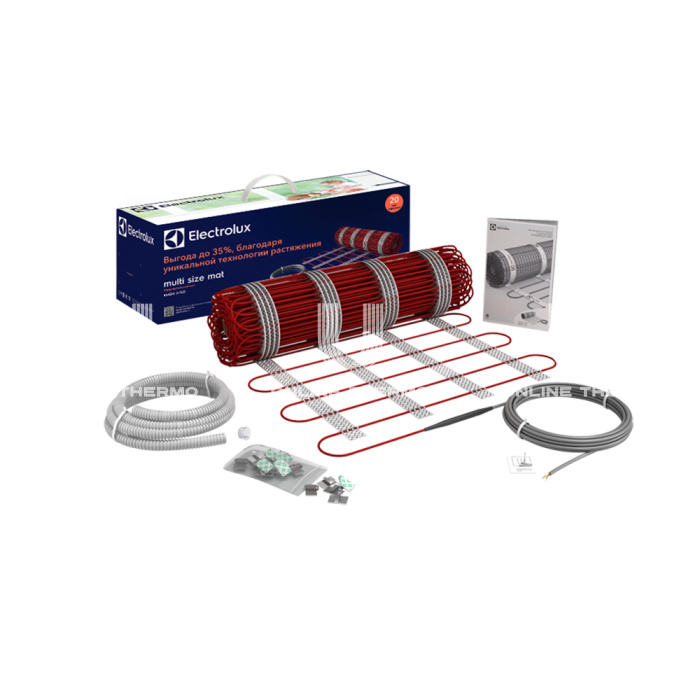 В сверхтонких нагревательных матах Electrolux MULTI SIZE MAT реализована инновационная запатентованная технология, не имеющая аналогов в России и СНГ — благодаря эластичной основе они способны растягиваться, увеличивая номинальную длину до 35%. Это позволяет варьировать площадь обогрева, и даже мощность мата от 111 до 150 Вт/м², создавая в одном помещении зоны с разной интенсивностью нагрева, что особенно актуально для совмещённых напольных покрытий (например, плитки и ламината).