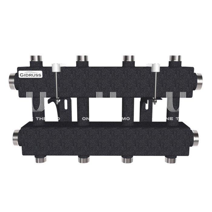 Модульный коллектор MK-150-4DUx25 предназначен для распределения теплоносителя по контурам или его сбора в каскад для вывода на гидравлический разделитель GR-150-40