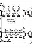 Распределительный коллектор (группа) с расходомерами Rehau HKV-D 12080311002 НР 1", на 3 контура 3/4" EK, нержавеющая сталь, с концевыми группами