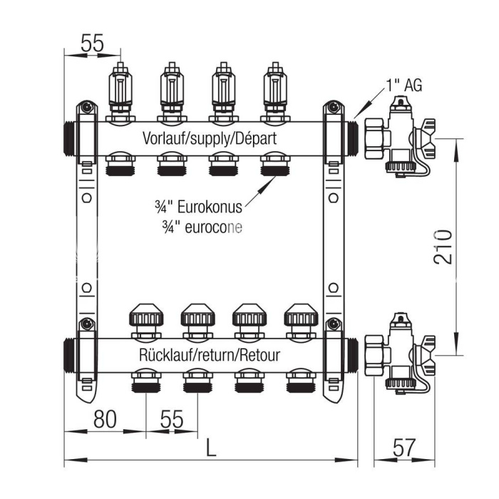 Распределительные коллекторы Rehau HKV-D из нержавеющей стали предназначены для систем обогрева поверхностей, в первую очередь для систем напольного водяного отопления. Регулируемая коллекторная группа представляет из себя подающий и обратный коллекторы G1" с наружной резьбой с расходомерами на подающей трубе и с запорными вентилями на обратной трубе. Коллекторы зафиксированы между собой при помощи звукоизолированных оцинкованных кронштейнов, на каждой из распределительных труб находятся ниппельные отводы под соединение евроконус G3/4". Обратная линия может быть укомплектована сервоприводами (сервомоторами) для автоматического регулирования, резьба подключения сервопривода - М30х1.5. В комплект уже входят две никелированные заглушки G1" со встроенными воздушными клапанами и уплотнением.