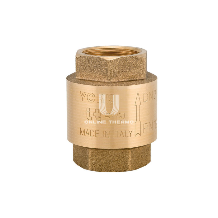 Клапан обратный пружинный с пластиковым затвором Itap серии York муфтовый предназначен для предотвращения обратного тока жидкости или газов в пределах допустимых значений по температуре и давлению. Применяется в системах водоснабжения и отопления, кондиционирования. Обратный клапан может быть установлен в любом положении: вертикально, горизонтально и наклонно. Обратный клапан York изготавливается из латуни, пружина – из нержавеющей стали, уплотнение – из NBR, прижимной диск, тарелка и шток – из нейлона, муфта с седлом – из латуни.