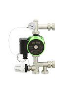 Насос группы обеспечивает циркуляцию в низкотемпературном контуре отопления. Заданная температура в этом контуре поддерживается термостатическим вентилем с установленной на нём термостатической головкой с погружным датчиком температуры. Необходимое количество тепла поступает из высокотемпературного контура отопления (котла). Температура подачи теплоносителя отображается на термометре.
